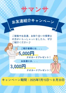 この夏、保育事業部サマンサではおともだち紹介キャンペーンを開催いたします!